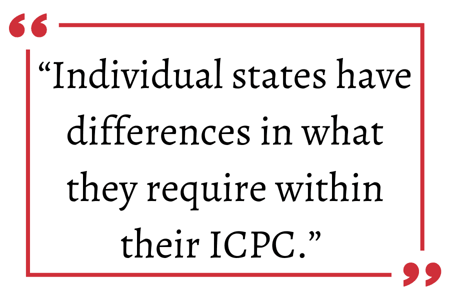 Individual states have differences in what they require within their ICPC; however, shared among them is a case plan, a summary of information on the child, and a financial and medical plan.